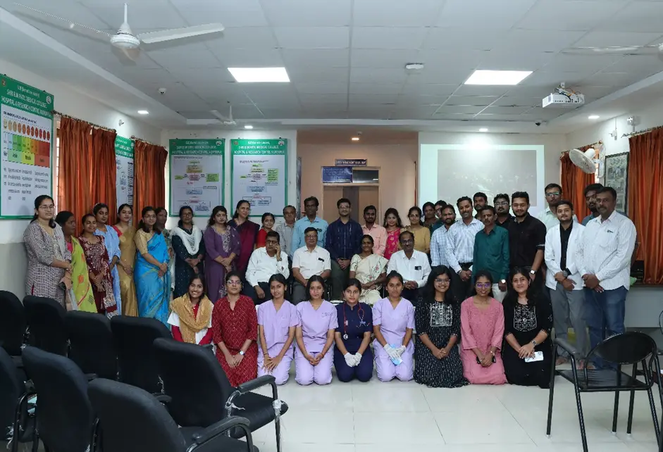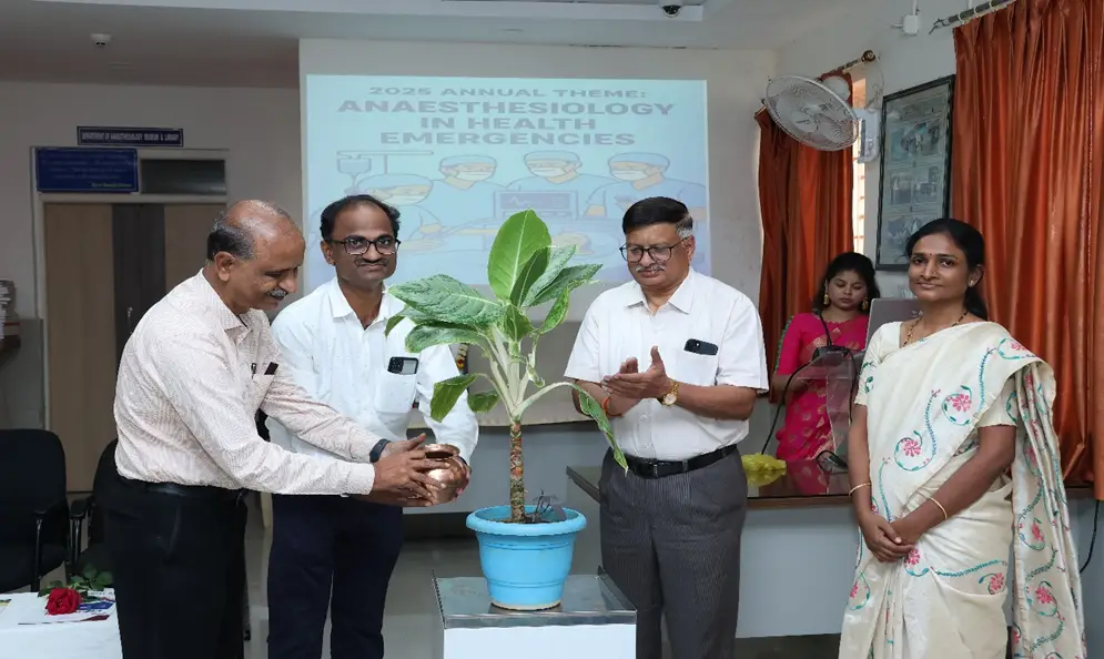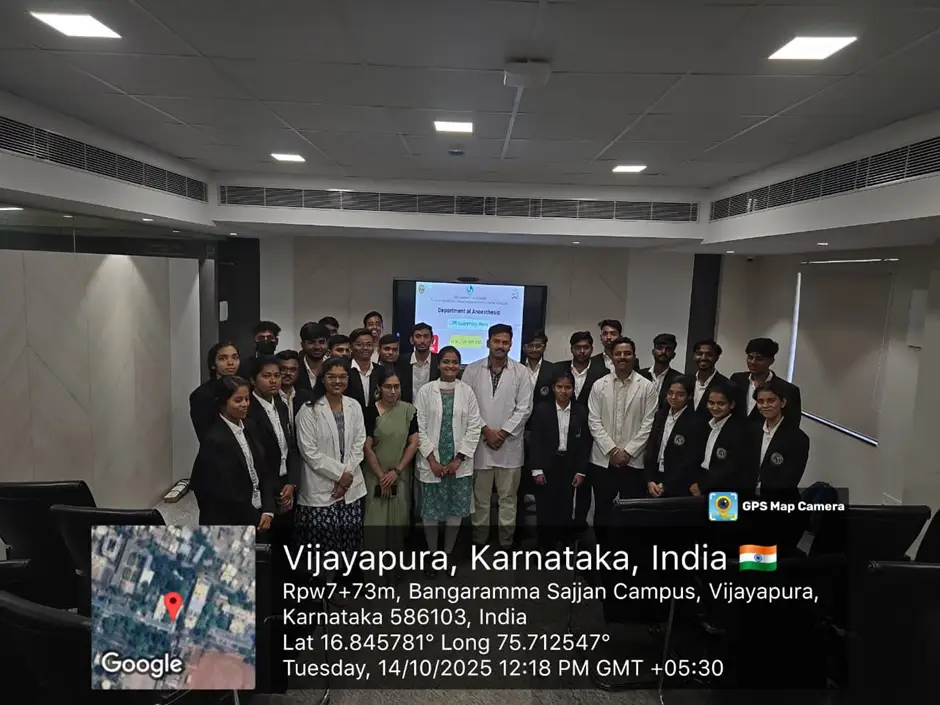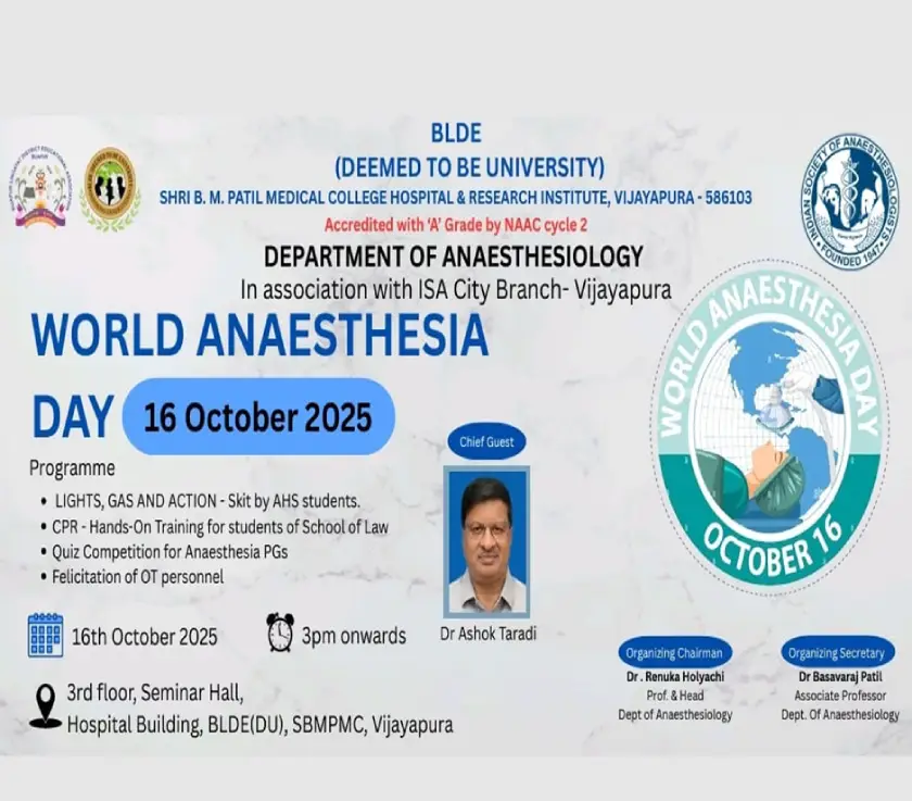 Dr. Ashok Taradi, Department RMO, Shri B. M. Patil Medical College, Vijayapur, was the chief guest for the event. We, the Department of Anesthesia, conducted the following activities: a BLS hands-on training programme for Shri B. M. Patil Law College students, in which about 90 students participated; a short film on “Anesthesia Awareness,” produced and presented by our postgraduates; a mime show presented by our B.Sc. Anesthesia students; a quiz for the postgraduates of the Department of Anesthesia; and the felicitation of two retired/senior OT personnel (three Class II workers). At the end, high tea was served to all the participants.