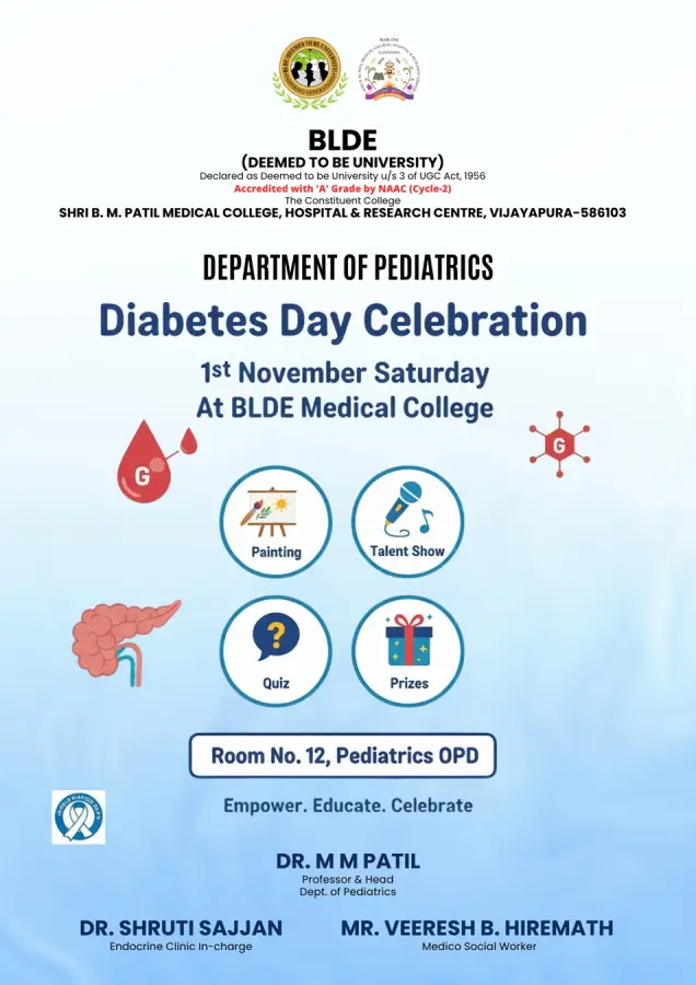 DESCRIPTION/OVERVIEW On 14th May2025  From 9 am to 1 pm   Dr.Shobha Badiger, visiting senior Consultant in pediatric bone marrow transplant (stem cell transplant) and Hematology Oncology, conducted Camp on thalassemia and HLA typing camp in thalassemia major, aplastic anemia and sickle cell anemia children below 12 years, in medical education unit and total 43 patients had come for consultation.   All the parents were given awareness about how thalassemia can be prevented during subsequent pregnancy in the same mother. Dr.Shobha also simplified the  definitive treatment aspect of thalassemia i.e BONE MARROW TRANSPLANTATION. Couple of parents expressed gratitude towards Dr.Shobha and doctors of paediatrics department, especially HOD Dr. M.M Patil sir who for helped during and after the process of bone marrow transplantation from BLDE institution. .after this many patients were included in the camp of HLA typing for further treatment. Stem cell register was  updated.